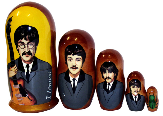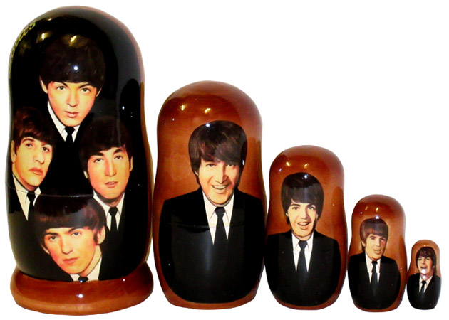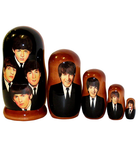 Beatles in Suits 1 Russian Dolls Set of 5 Dolls with gloss finish. 17.5 cm (7") tall approx. Colour may vary slightly from that shown. Comes with gift box.